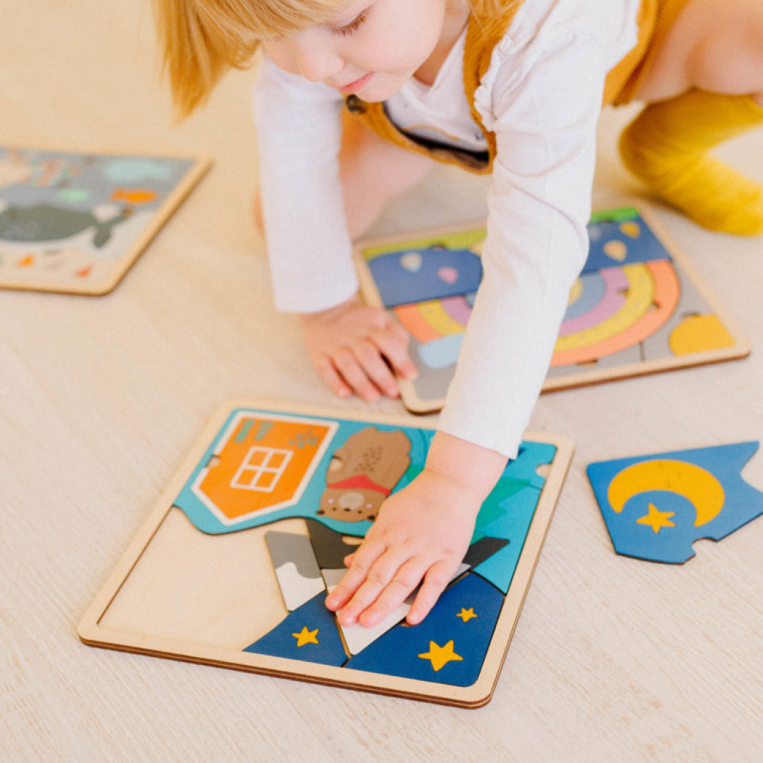 I was worried it might be too “simple” for my 2-year-old, but turns out the simplicity is what made it perfect. She instantly got how to turn and fit the shapes, and now uses the puzzle pieces to “tell stories” about the moon and stars and bear. It’s more than a puzzle—it’s become part of her quiet time routine.